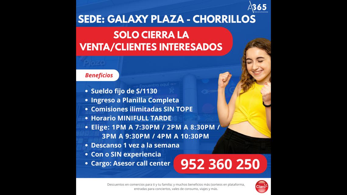 ¡Postula Aquí! Contrato Sin experiencia/Mini Full PM/2PM A 8PM/Asesor Claro/Pagos 15nales - Sede Galaxy Plaza + Sueldo fijo + Planilla completa + Comisiones ilimitadas + Pagos Quincenales