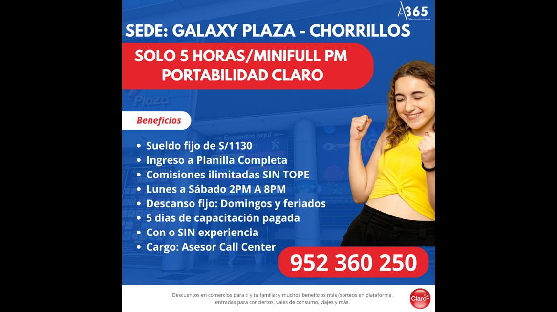 ¡Solo 5horas y gana 1130+Comisiones!/MINI FULL 2PM A 8PM/Asesor Claro Perú/Te capacitamos - Sede Galaxy Plaza + Sueldo fijo + Planilla completa + Comisiones ilimitadas + Pagos Quincenales