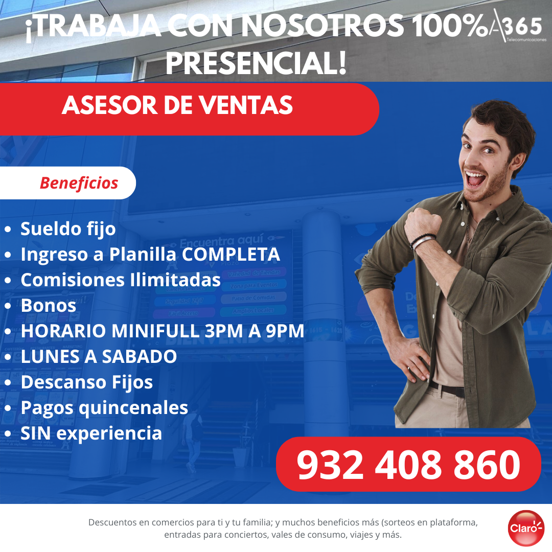 ¡Asesor de ventas!/Trabaja Solo 6 horas¡Sin experiencia!/¡Solo de Lunes a Sabado!/Descanso Fijo - Sueldo Fijo+Planilla completa+ Comisiones ilimitadas